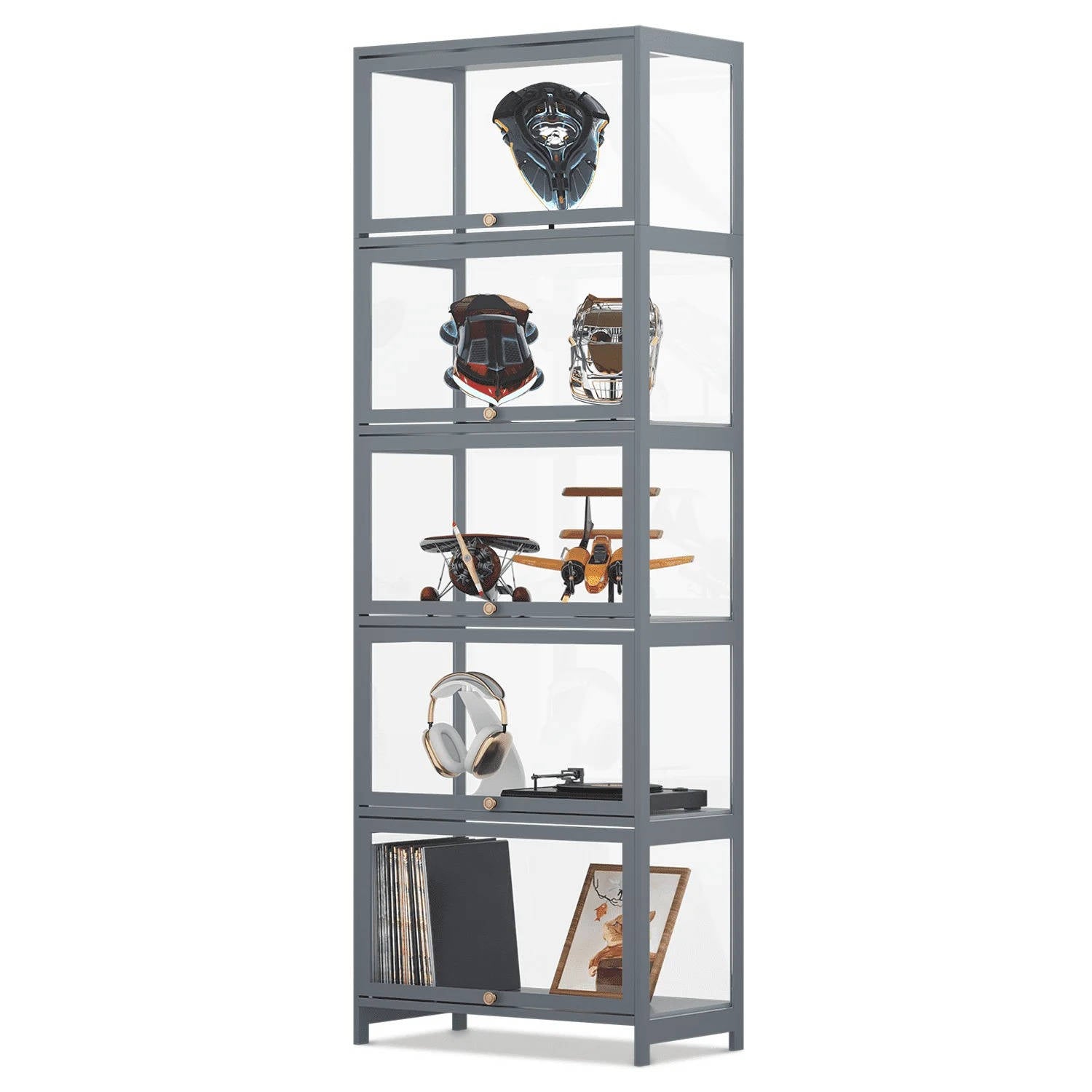 Pięć półek z 13 in odstępem na wysokie przedmioty i różnorodne kolekcje.